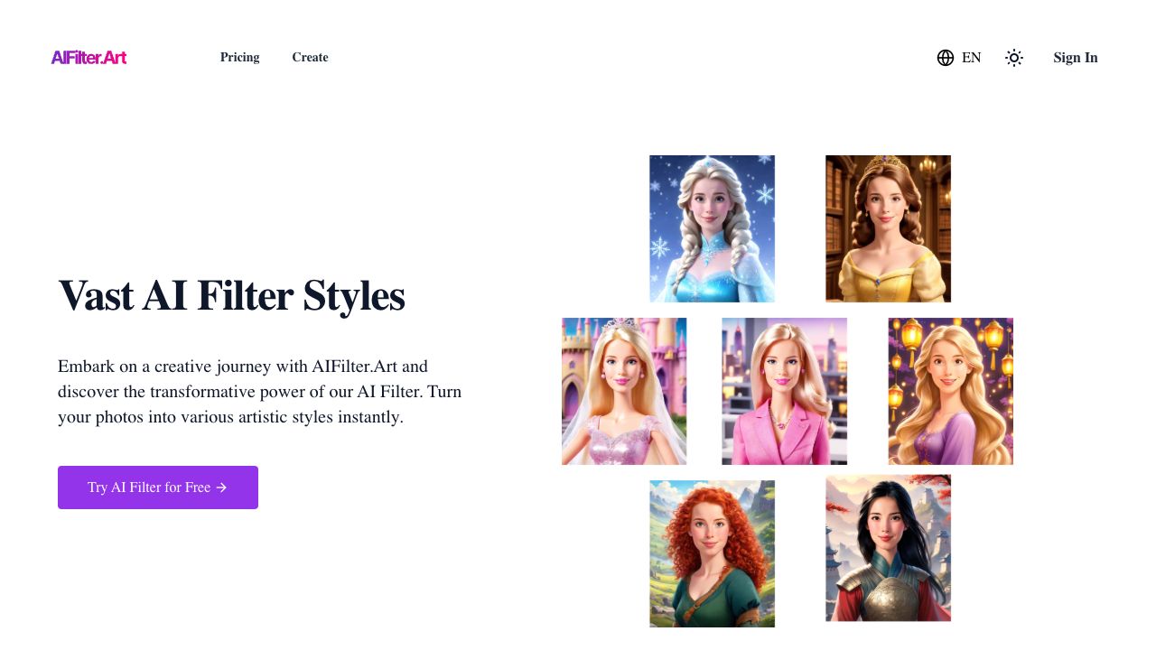 AIFilter.Art is an AI-powered platform that transforms photos into various artistic styles, including PS2, Barbie, Anime, Disney, Sketch, and Watercolor. It allows users to create unique portraits and profile pictures using AI filters.