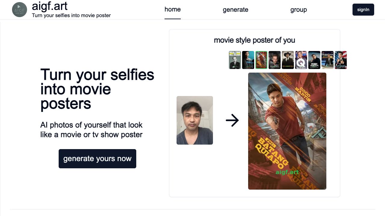 aigfaigf.art is an online tool that uses AI to create movie-style posters from your selfies. You only need to upload a selfie, and the AI will generate a movie poster featuring you.