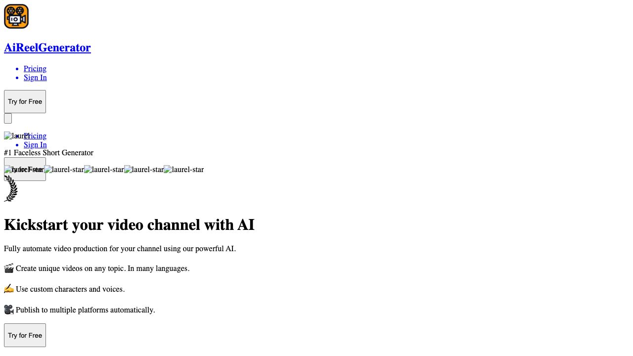 AiReelGenerator.com is a cutting-edge app that fully automates the creation of faceless videos. Simply choose a topic, and the AI will generate and upload new videos to your Youtube, TikTok, Instagram, or Facebook account every day. It allows users to kickstart their video channels with AI, create unique videos on any topic in many languages, use custom characters and voices, and publish to multiple platforms automatically.