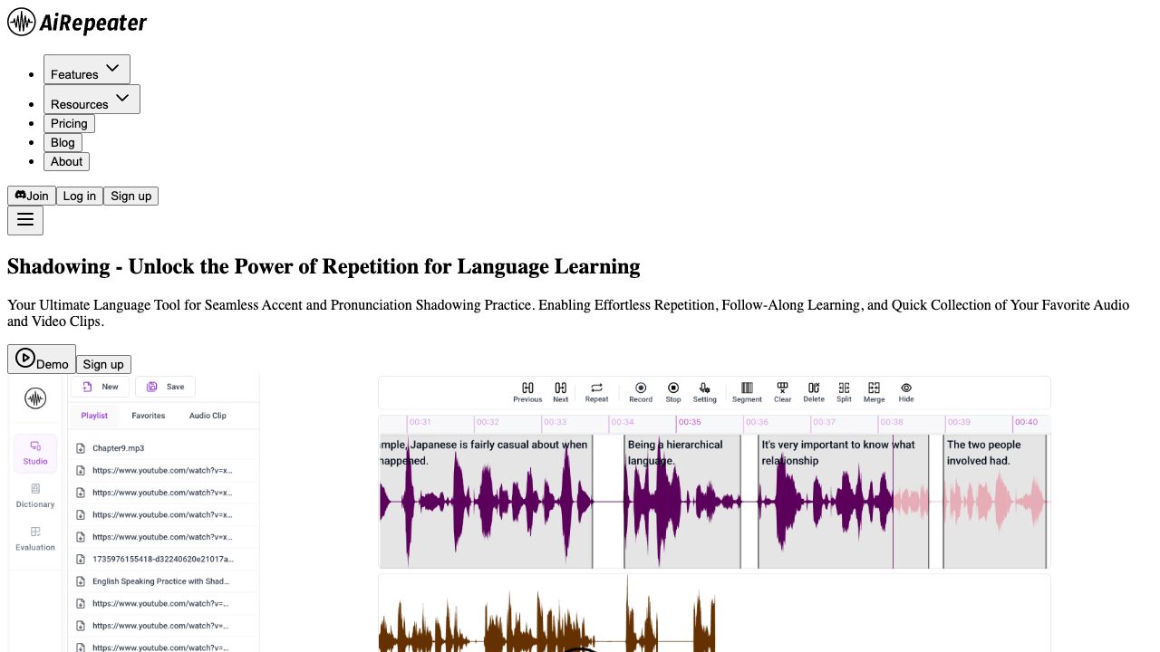 AiRepeater is an AI-powered shadowing technique tool designed for language learning. It helps users improve their pronunciation and accent through audio/video repetition, follow-along learning, pronunciation assessment, and a built-in real voice dictionary. The platform supports local files and YouTube videos, offering features like smart repetition, clip merging/export, and automated assessment.