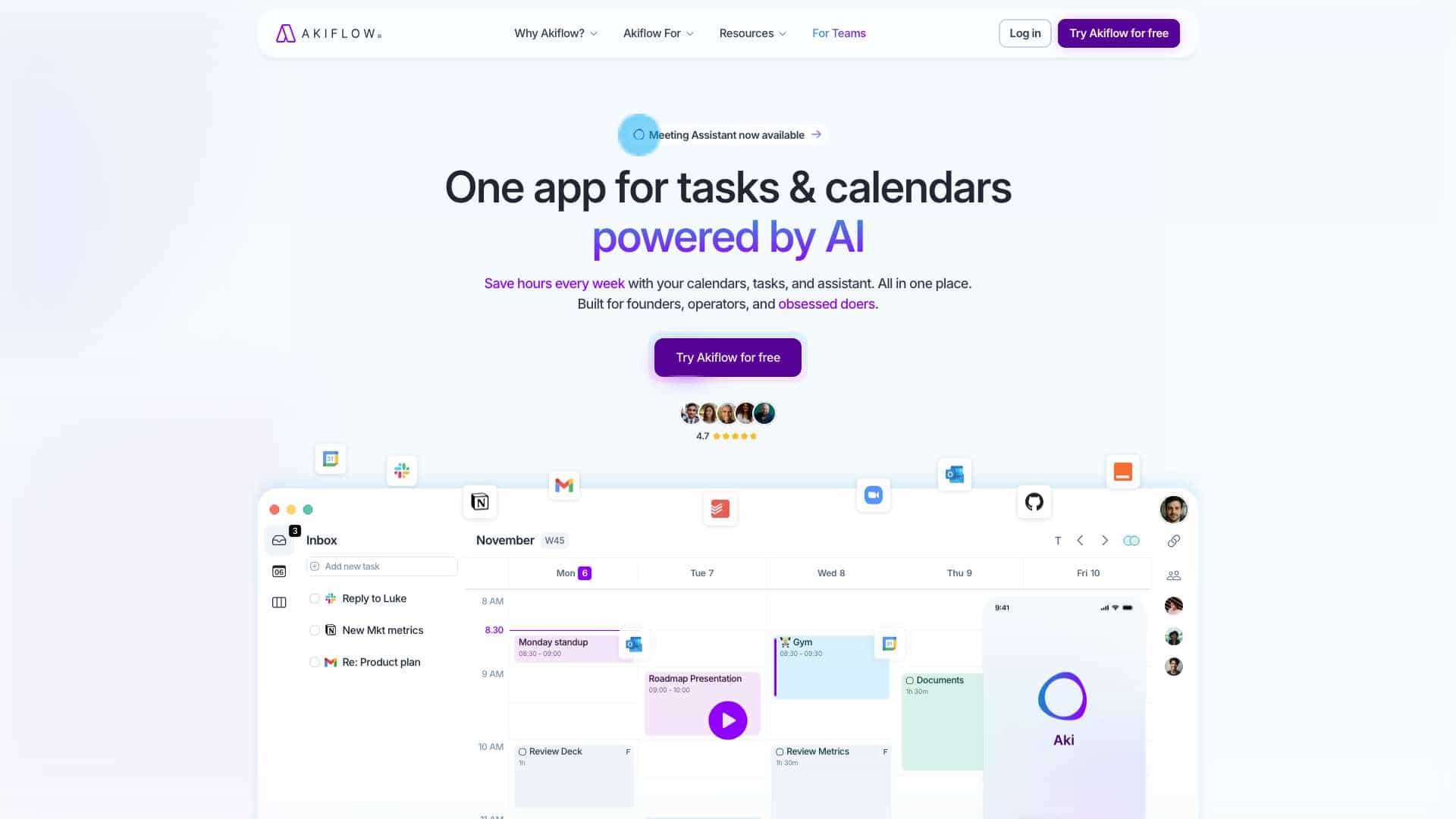 Akiflow automatically imports tasks from integrated tools into a universal inbox. Users can then drag and drop events, tasks, and time slots into their calendar to build a plan. The AI assistant, Aki, can automate routines and reschedule conflicts.