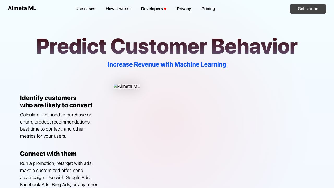 To use Almeta ML, create an account, install a web tag on your website, and start tracking events. Choose pre-built or custom ML models to predict customer actions and send the results to selected destinations like advertising platforms or e-commerce services.