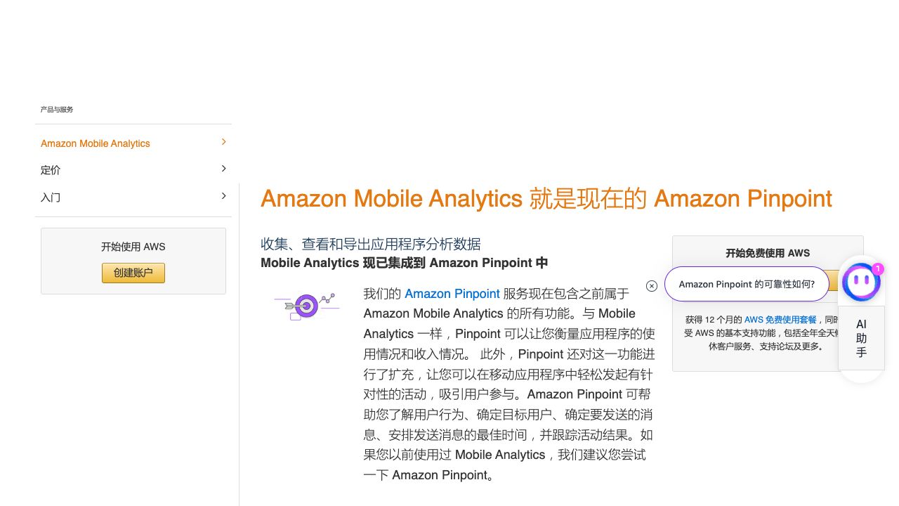 Amazon Mobile Analytics 是一项方便您轻松地大规模收集、可视化并理解应用程序使用数据的服务。