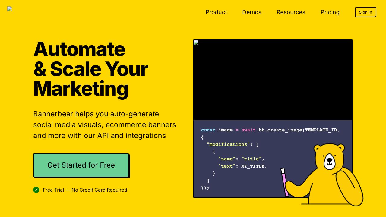 Bannerbear is an API-driven platform that helps individuals and teams automatically generate social media visuals, e-commerce banners, podcast videos, and more. It turns graphic templates into an API, allowing for the automated creation of variations. It offers APIs for image, multi-image, video, and PDF generation, along with integrations for popular tools like Zapier, Airtable, Make.com, Forms, and WordPress, enabling no-code automated workflows for repetitive marketing tasks.
