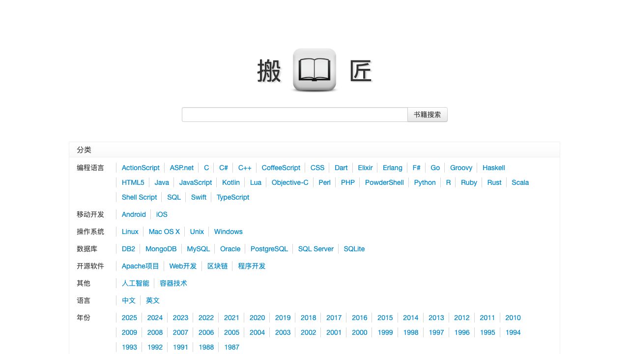 搬书匠 is an ebook search and download tool that provides access to a wide range of technical books, including programming languages, AI, web development, and more, categorized by topics and years for easy navigation.