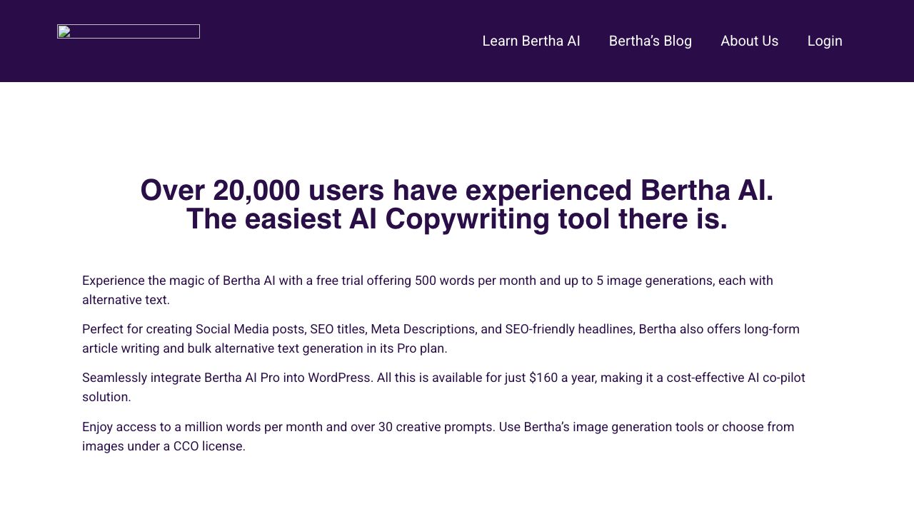 Bertha AI is an AI-based automatic content generation tool trained on hundreds of billions of lines of content to help you write better content on your WordPress website and Chrome. It leverages the power of ChatGPT and Open AI plus Stable Diffusion in an easy-to-use interface for WordPress and Chrome. Bertha AI helps you generate engaging, converting copy saving you up to 90% of your time. Also, you can create mesmerizing images for your website in seconds and in every possible style. With Bertha, you can write your next blog post in minutes rather than hours and get engaging, creative and converting content.