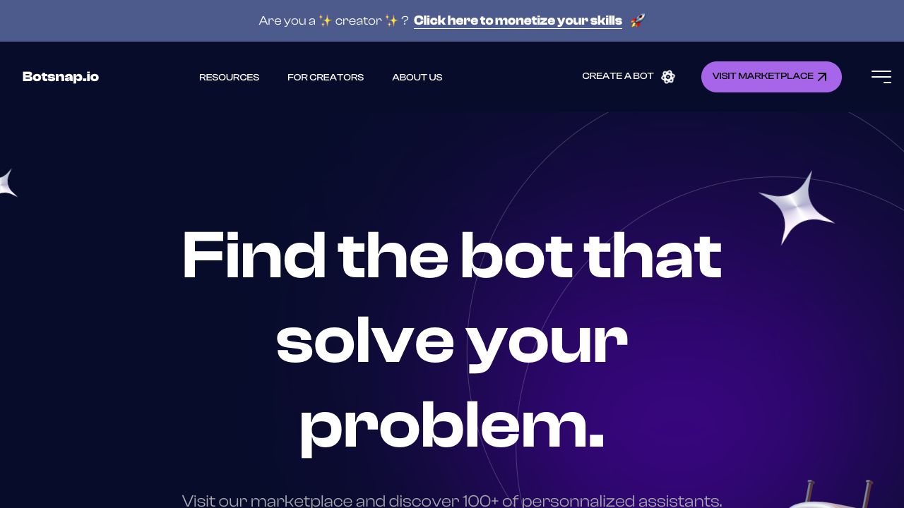 Botsnap is a platform designed to help users find the best custom AI assistants, GPTs, and AI agents. It offers reviews, a marketplace, and resources for creators to monetize their skills. Botsnap aims to revolutionize problem-solving by providing personalized AI solutions tailored to specific needs.