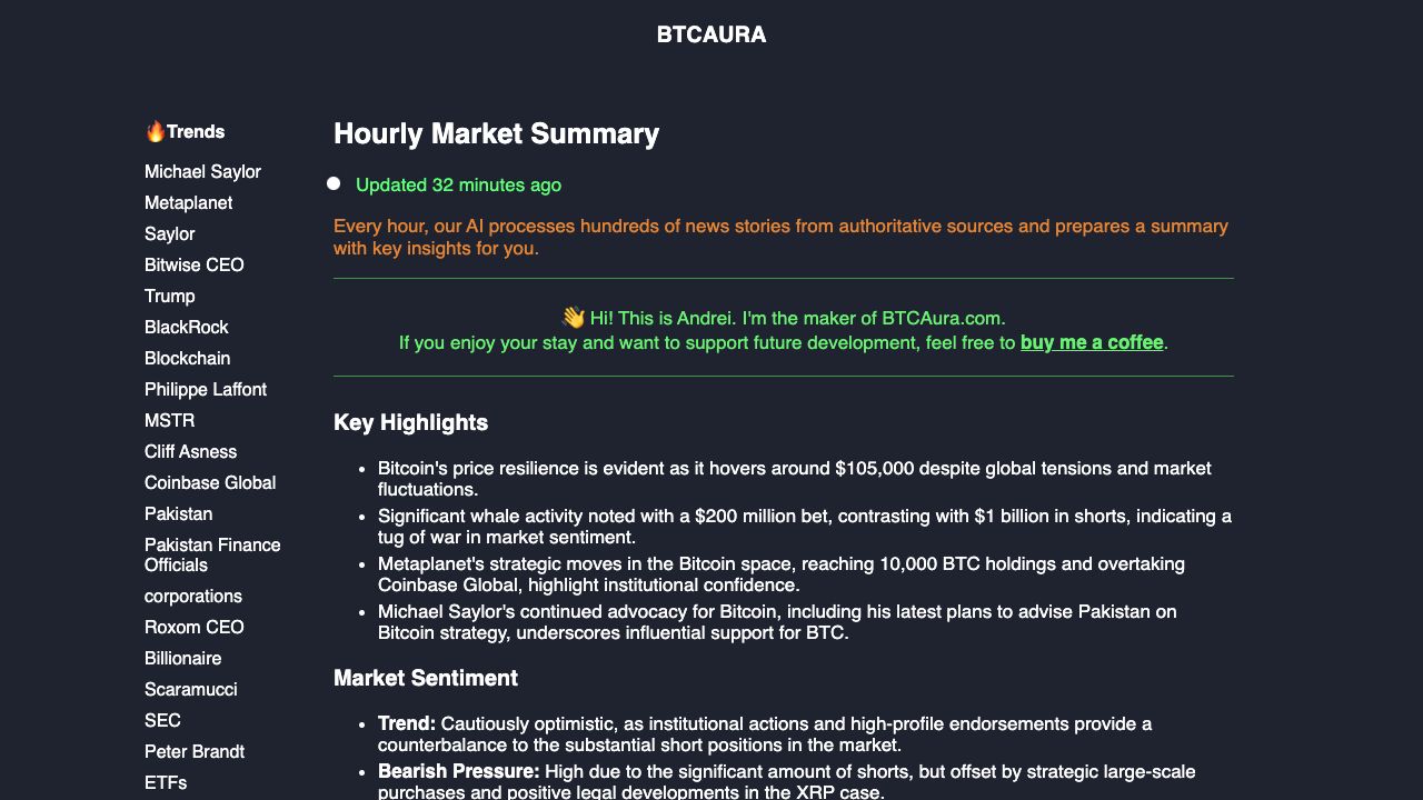 BTCAura aggregates news stories from various sources, processes them with AI, and provides hourly summaries with key highlights, market sentiment analysis, and Bitcoin forecasts. Users can stay updated with the latest developments and trading insights.