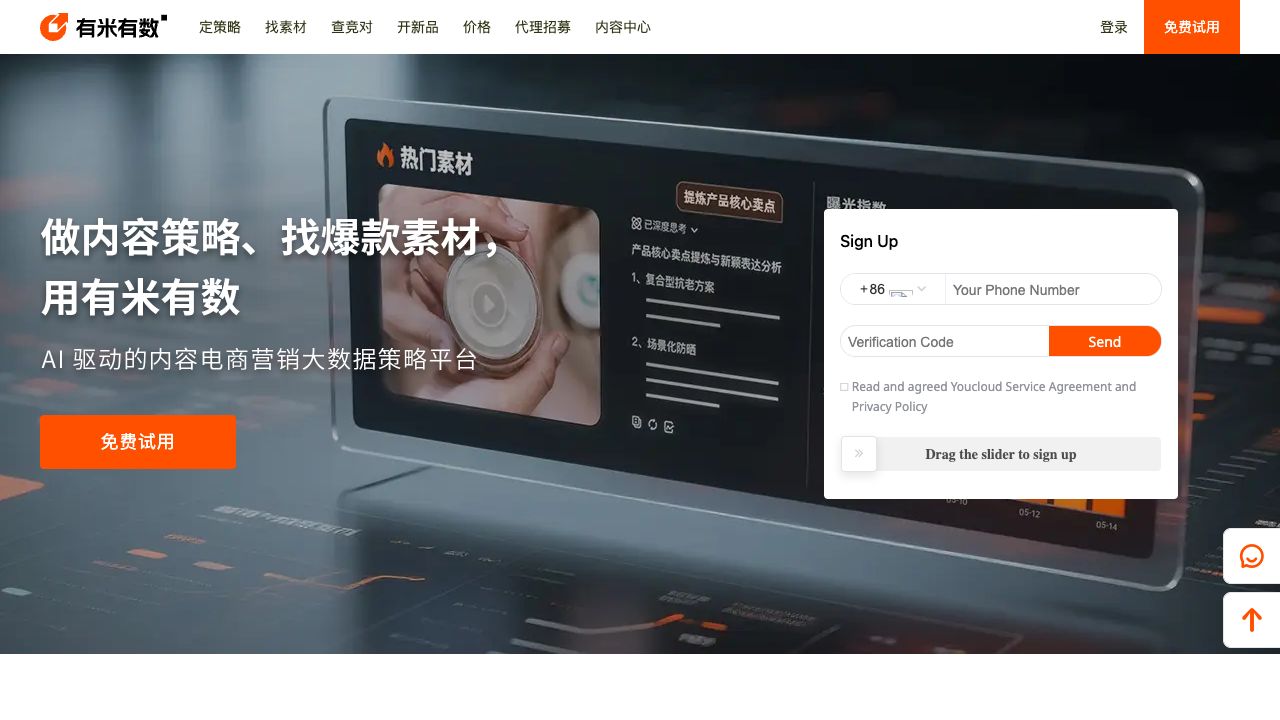 有米有数是有米云旗下专业的电商广告营销分析与投放平台,提供5亿商品库,1.8亿广告素材,监测80万商家,5分钟同步更新数据。覆盖商品广告素材分析、电商爆品数据、带货达人数据、同行商家分析、广告投放提效工具等五大能力,致力于让商家的生意增长心中有数。