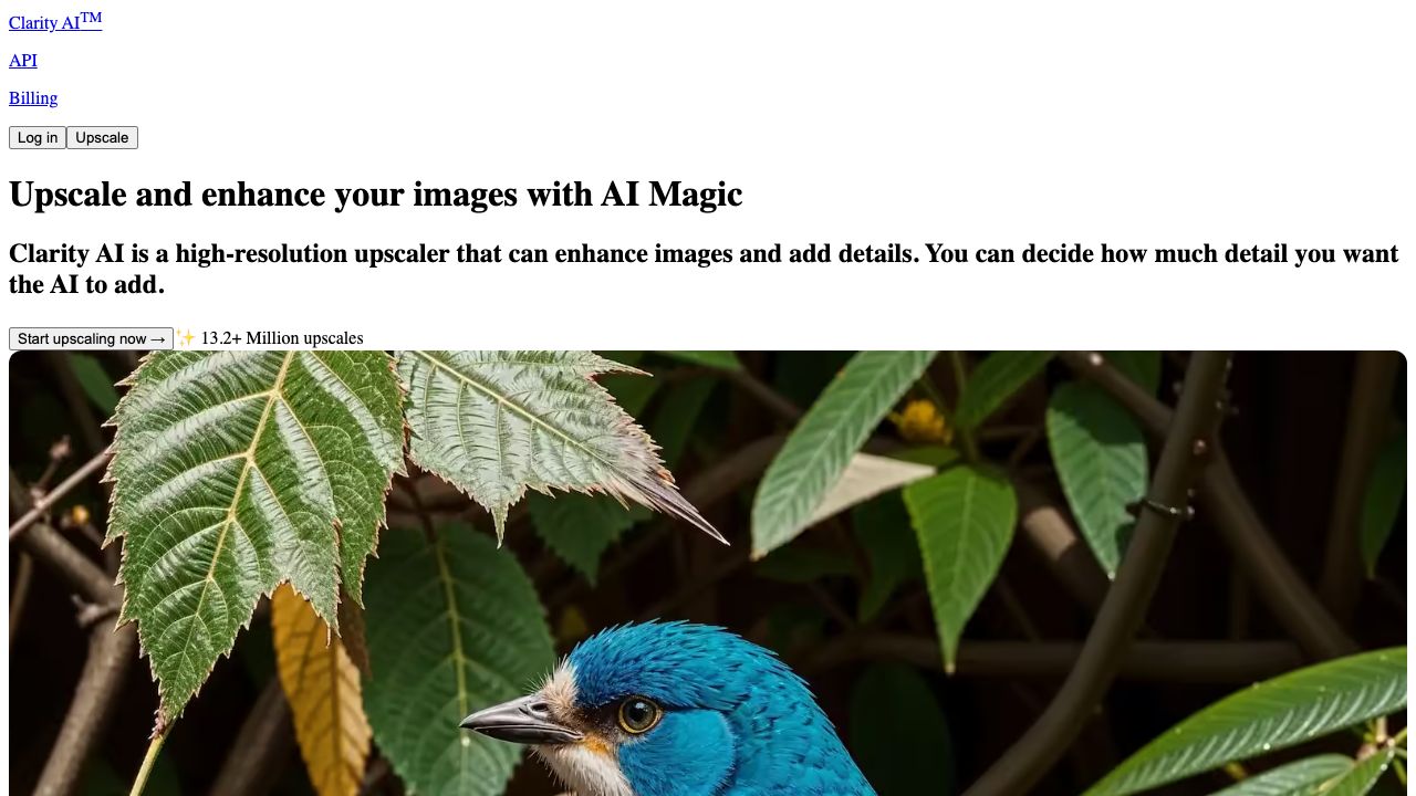 Clarity AI is an AI-powered image upscaler and enhancer that allows users to increase image resolution up to 13,000px (176 megapixels). It also offers features to enhance image details, remove noise and blur, fix artifacts in AI-generated images, and style transfer images. An API and ComfyUI plugin are available for integration into other applications.