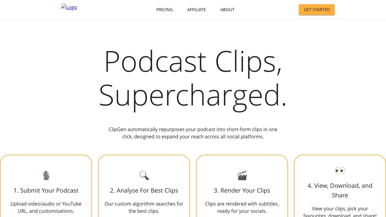 1. Submit Your Podcast: Upload video/audio or YouTube URL, and customisations. 2. Analyse For Best Clips: Our custom algorithm searches for the best clips. 3. Render Your Clips: Clips are rendered with subtitles, ready for your socials. 4. View, Download, and Share: View your clips, pick your favourites, download, and share!