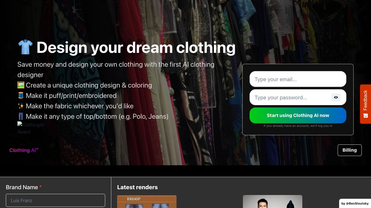Design clothing by providing a brand name, specifying shirt/pants type, uploading an image (optional), entering a prompt, and selecting the number of renders. The AI will generate clothing designs based on the input.