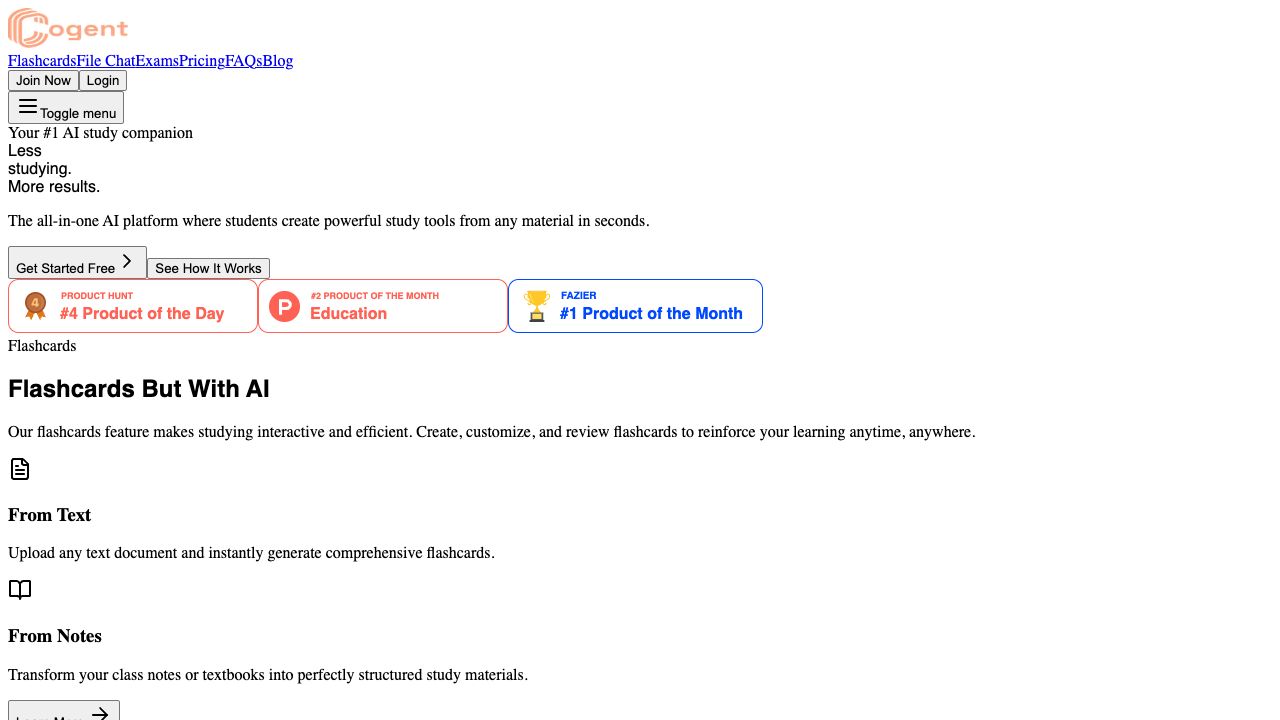 Cogent is a personal tutor with AI-driven tools for studying. From speedy flashcard generation to AI chatbots trained on information you feed them, Cogent makes learning collaborative and organized. It is an AI-driven learning platform that enhances the study process with a variety of tools like quizzes, flashcards, AI-Exams, File Chat and much much more.