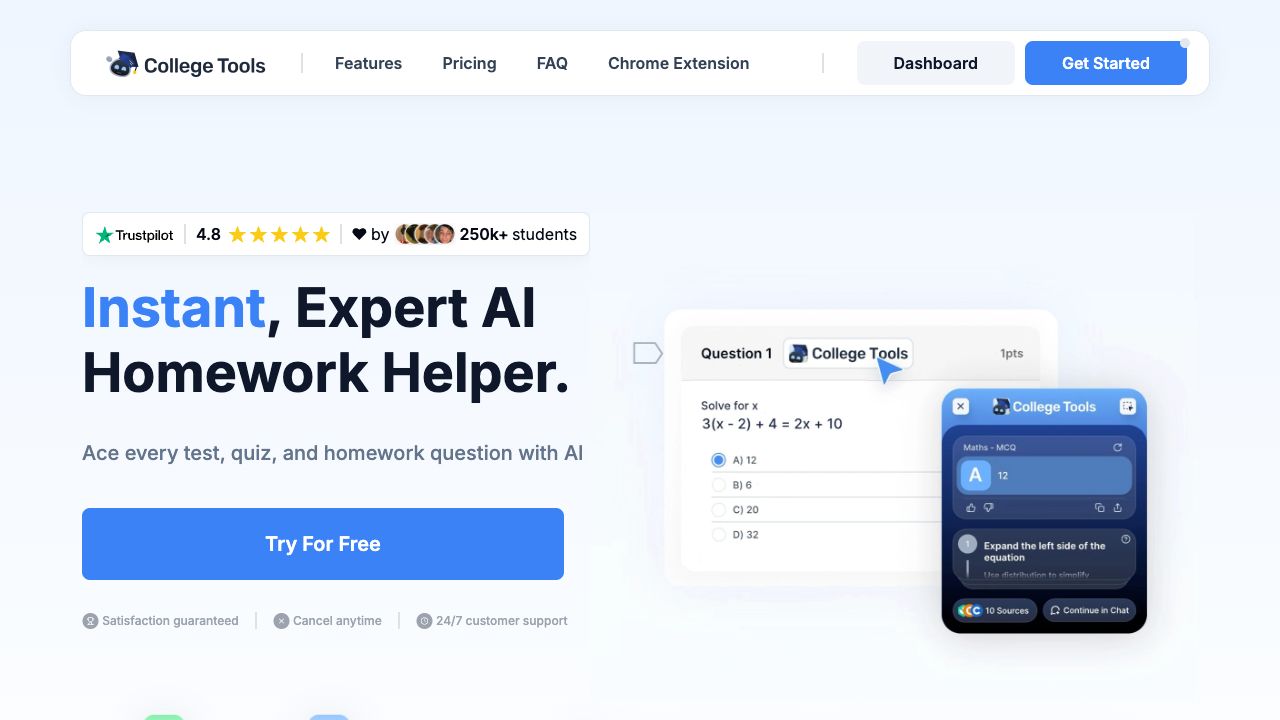 College Tools is an LMS-integrated AI homework helper designed to assist students across all subjects and academic levels. It offers tools such as a Chrome extension for real-time responses, a mobile app for instant answers, and an AI chat for detailed educational support. The software aims to provide accurate quiz solutions, step-by-step guidance, and prevent detection by universities, supporting learning on platforms like Top Hat, Blackboard, Canvas, Schoology, and Moodle.