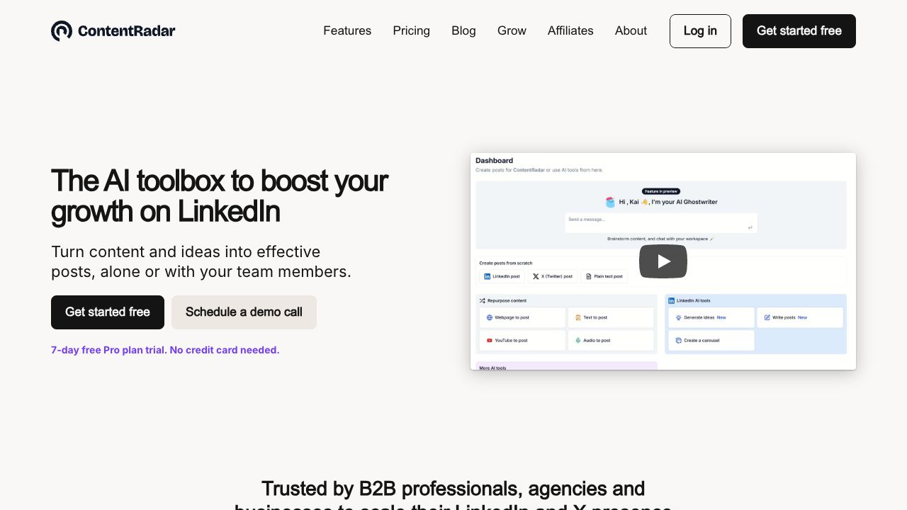 ContentRadar is an AI-powered tool designed to streamline content creation and management for LinkedIn and X (Twitter). It helps B2B professionals, agencies, and businesses scale their social media presence by repurposing content, generating tailored ideas, and writing engaging posts. It also offers features for scheduling, collaboration, and analytics.