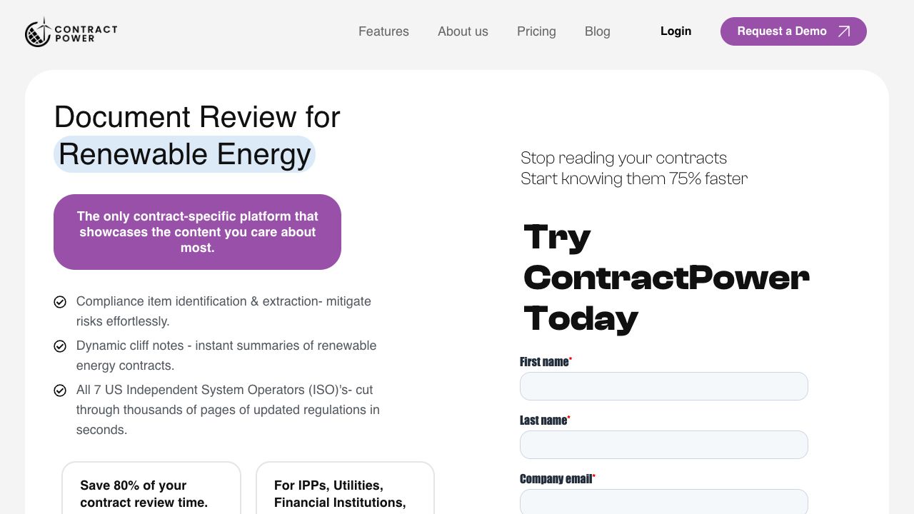 Contract Power elevates contract analysis in the renewable energy sector with AI tailored specifically for industry nuances. Our prompt-engineered platform automates compliance extraction and provides precise document summaries. It helps renewable energy professionals streamline contract and regulation review, ensuring critical compliance items aren’t missed. ContractPower reduces the amount of time spent reading contracts and regulations from 12 hours a week to 3 hours.