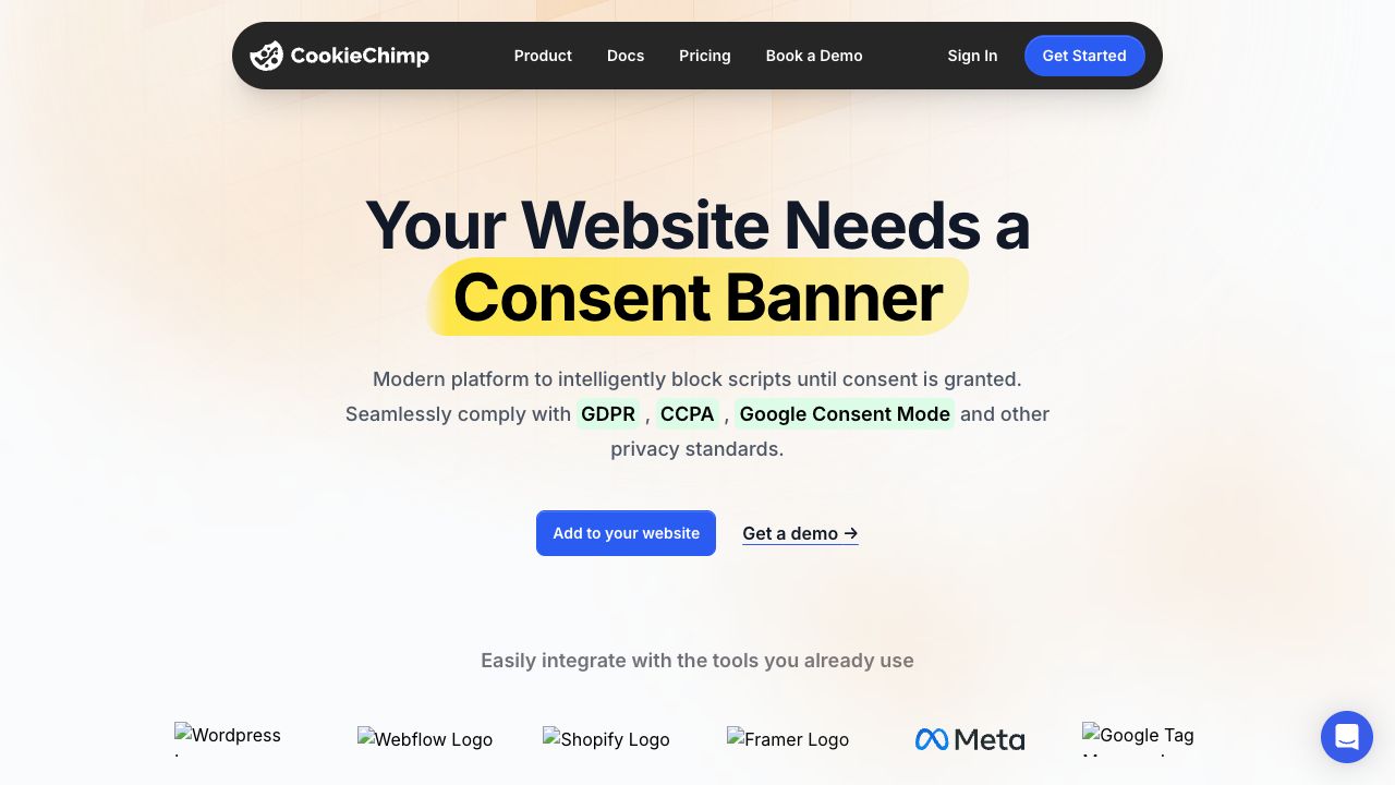 Integrate CookieChimp with your website to automatically scan cookies, create customizable consent banners, and manage user consent preferences. The platform provides a dashboard to monitor consent data in real-time and optimize opt-in rates.
