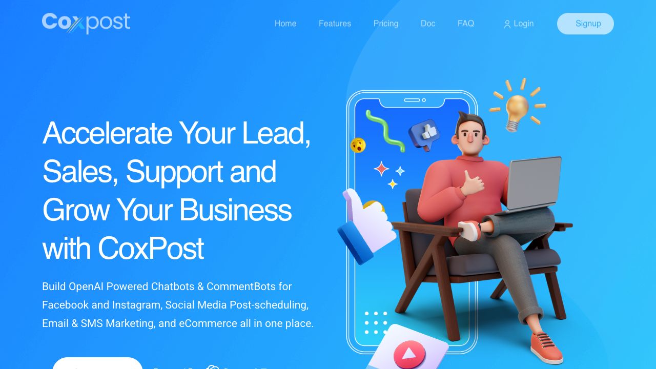 CoxPost allows users to build OpenAI-powered chatbots and CommentBots for Facebook and Instagram, schedule social media posts, manage email and SMS marketing, and integrate eCommerce all in one place. Users can start with a free trial.