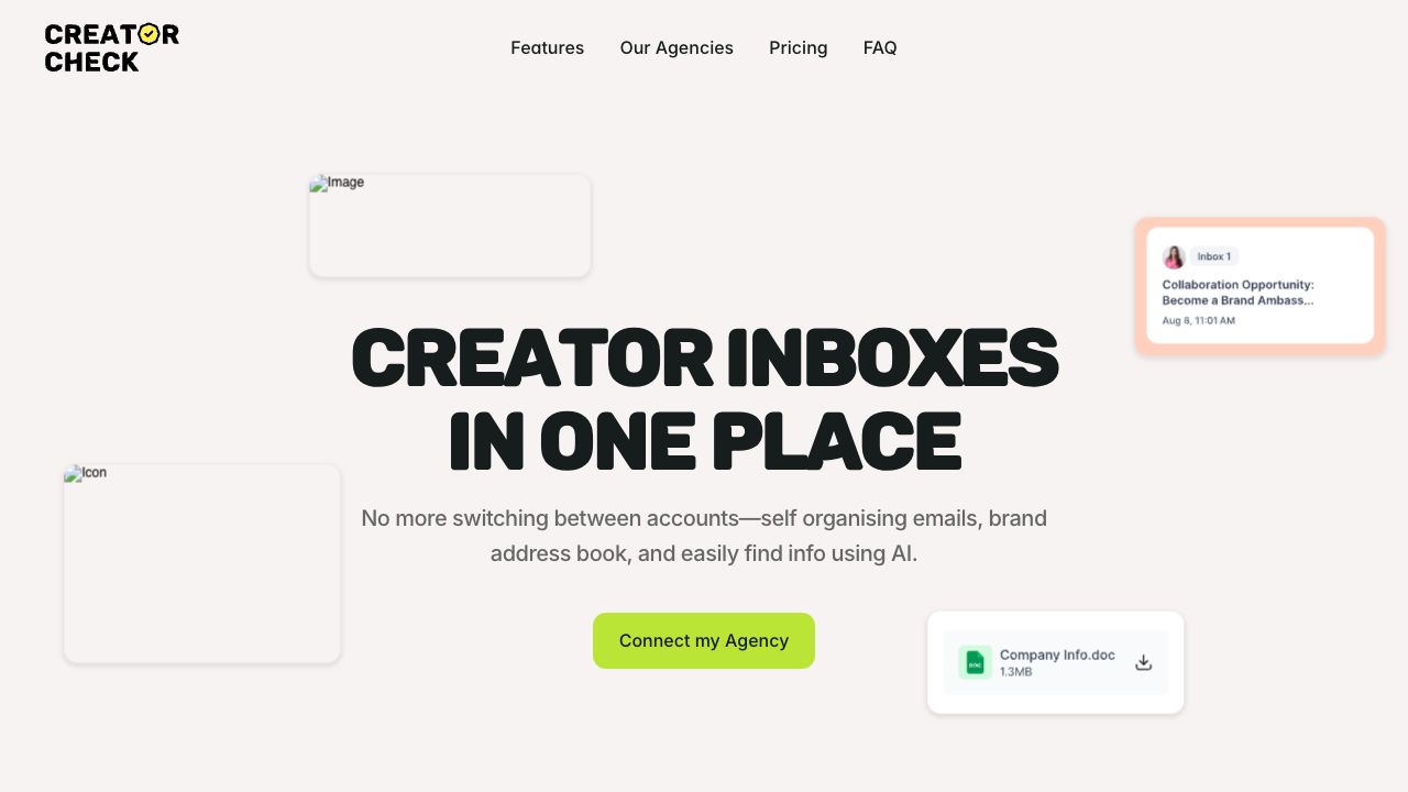Creator Check is an email management tool designed for influencer agencies. It helps save hours every week by managing all creators’ emails in one place, staying on top of brand deals, and never missing a payment or opportunity. It includes features like a smart inbox, brand book, and AI assistant, all built to simplify life for influencer agencies.