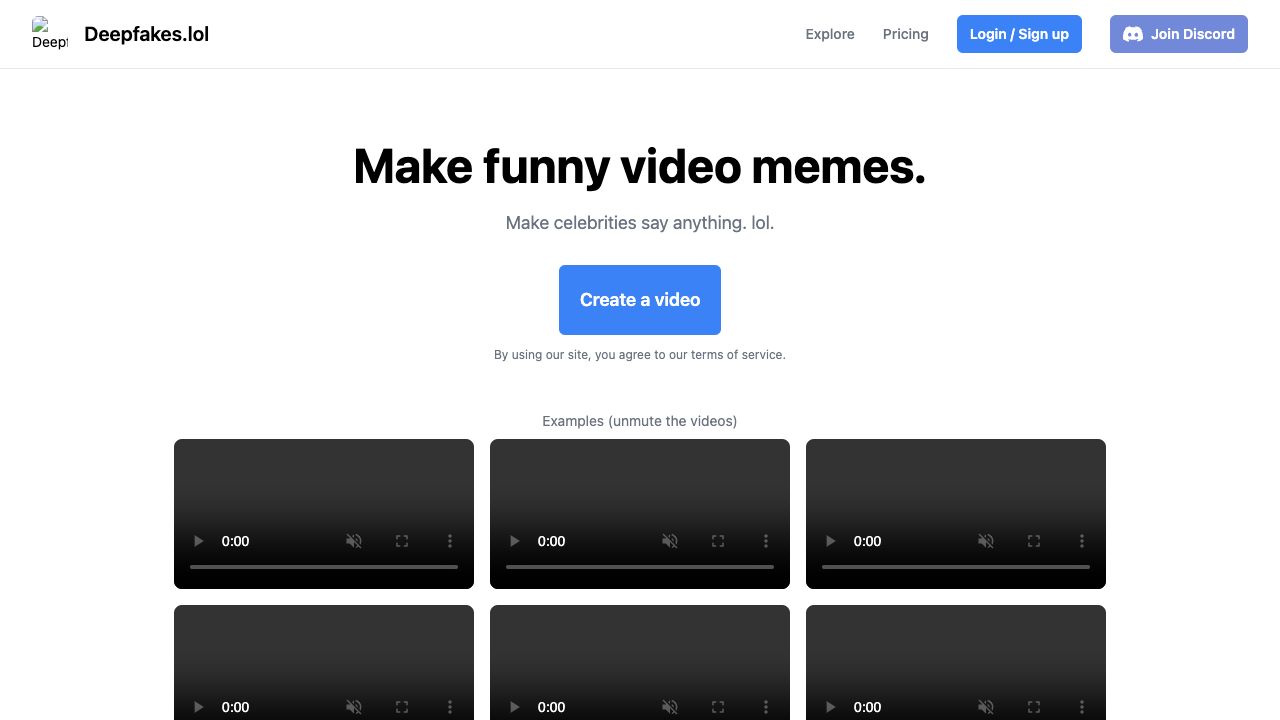 Deepfakes.lol is a website that allows users to create lip-synced, deepfake videos. It enables users to make funny video memes and make celebrities say anything. The site offers options to explore existing content, check pricing, and login/sign up. It also provides a Discord community for users to join.