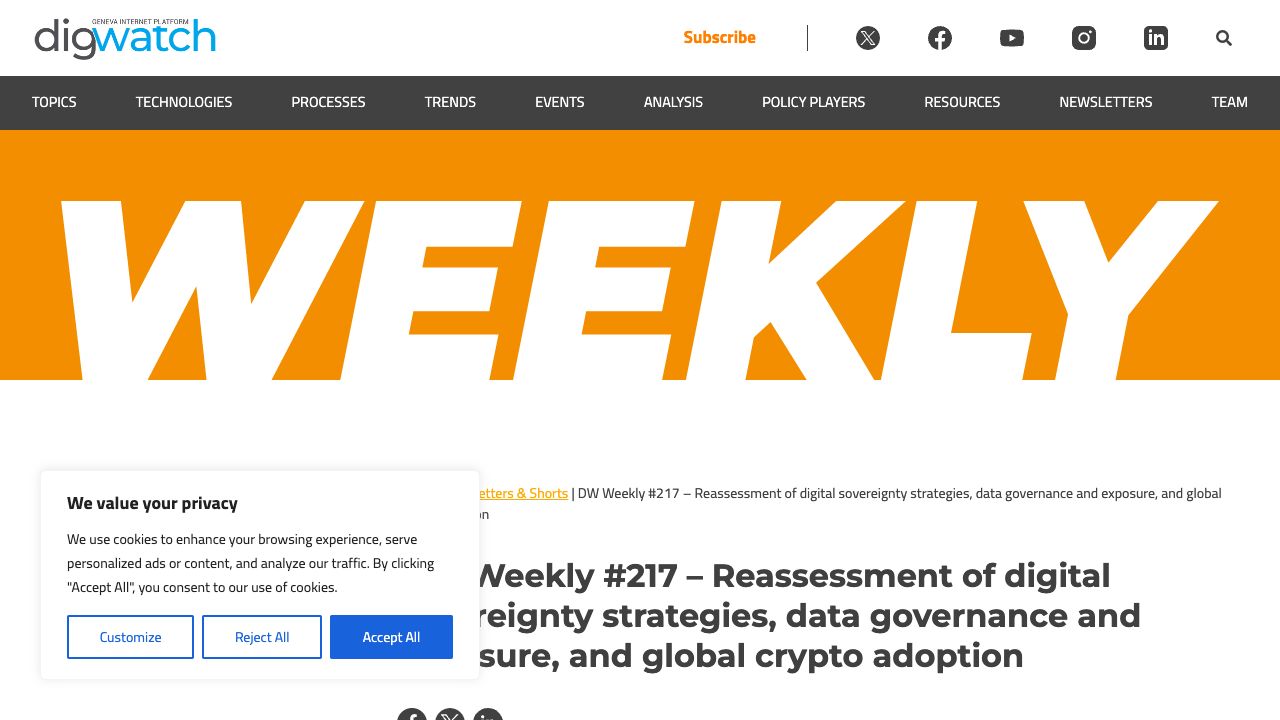 The Digital Watch observatory is a comprehensive digital policy observatory, which provides a neutral one-stop shop for the latest developments, overviews, events, policy players, instruments, and other resources. The observatory is part of thehttps://www.giplatform.org/https://www.giplatform.org/, an initiative of the Swiss authorities, operated byhttps://www.diplomacy.edu/https://www.diplomacy.edu/. The observatory: • maintains a comprehensive live summary of the latest developments in digital policy; • provides an overview of issues, actors and ongoing processes; • maintains a live calendar of upcoming and past events, and public consultations, and provideshttps://dig.watch/reportinghttps://dig.watch/reporting; • provides access to the latest research and data on internet policy; • is enriched by quantitative research (e.g. data-mining of open data, topic profiling); • relies on a team of 30+ digital policy experts from around the world, for digital policy research and analysis.