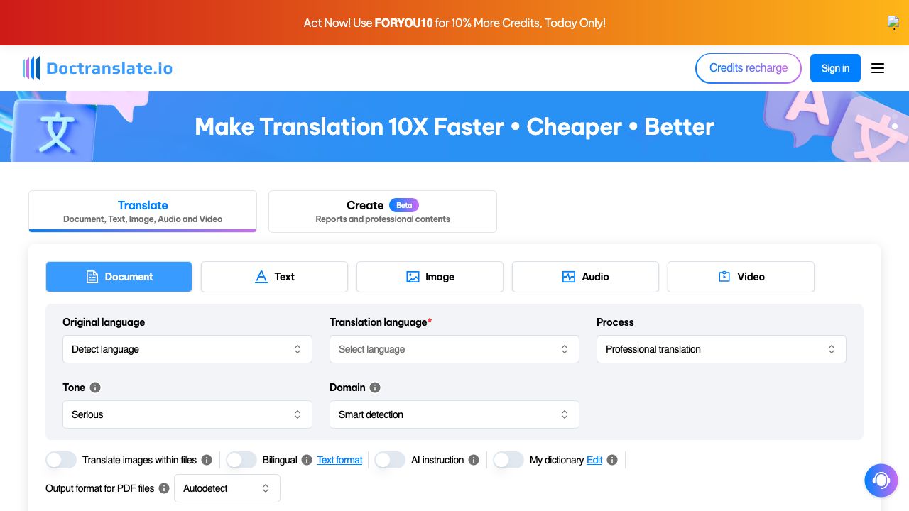 DocTranslate.io is a document translation tool that combines speed, accuracy, and cost-effectiveness. It supports over 85 languages and handles various file types, including Word, Excel, PDF, and PowerPoint. It offers features like retaining the original document format, customizable dictionary and styling, and guarantees security and privacy. It also provides image and audio translation, document summarization, and writing style improvement.