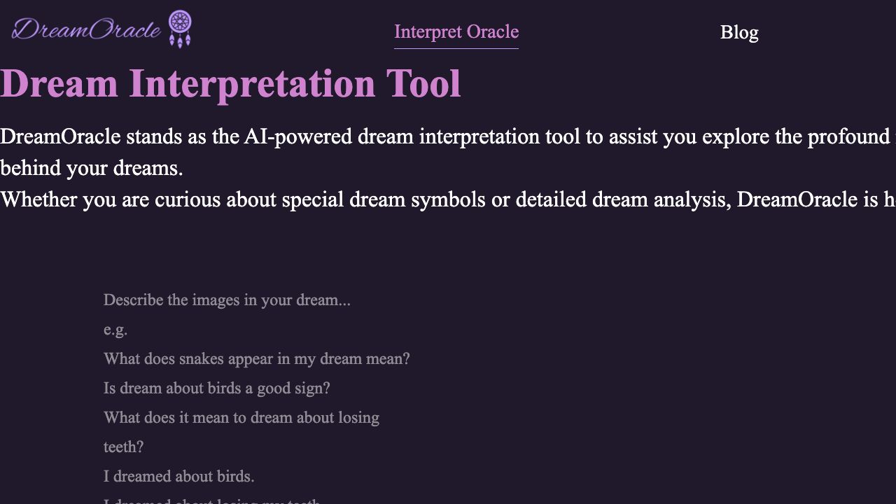 Describe the images in your dream to DreamOracle's AI dream interpreter for personalized analysis. DreamOracle dives deep into the content of your dreams, weaving together symbols, emotions, and behaviors to provide you with insights tailored just for you.