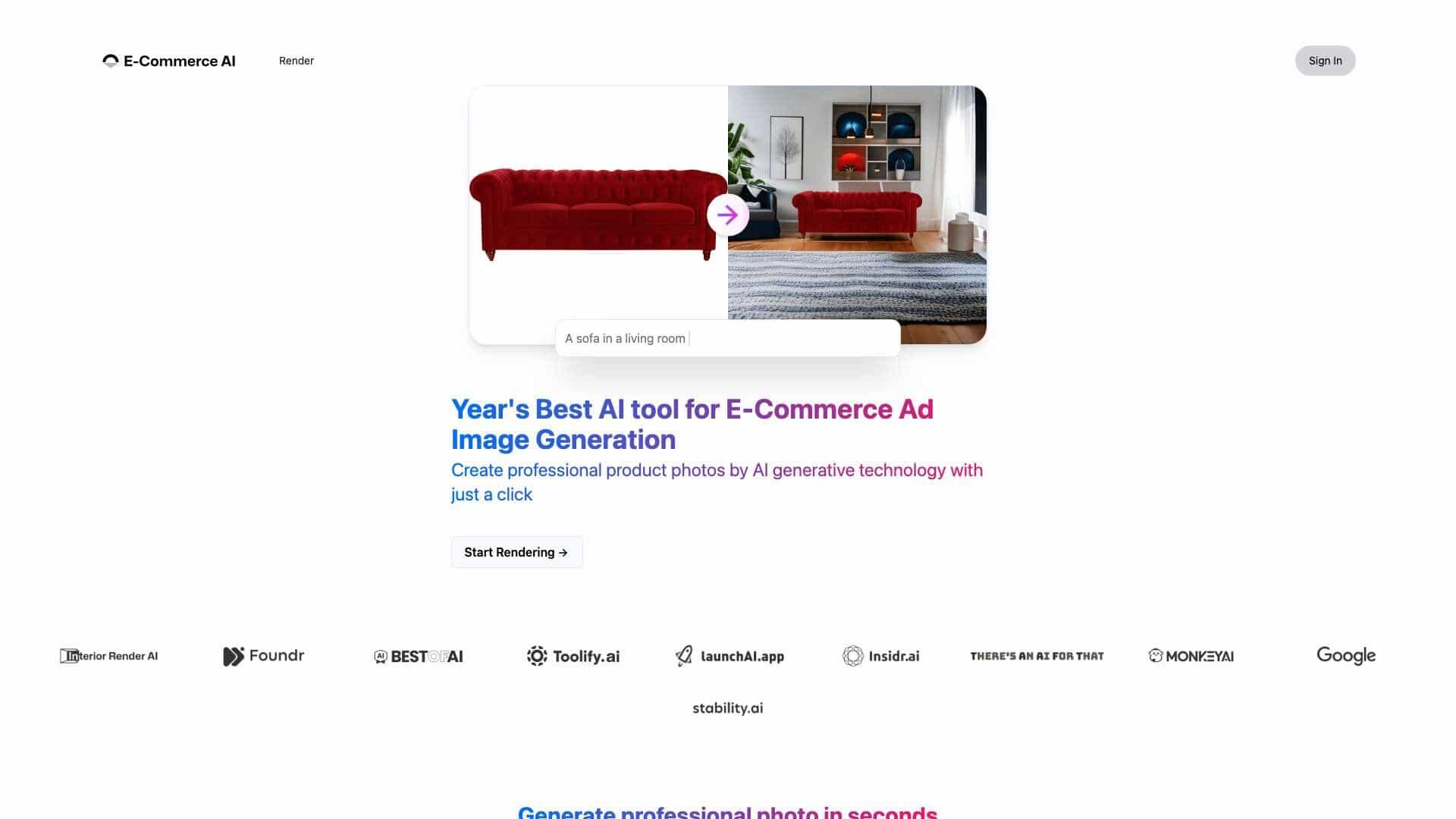 E-Commerce AI is a tool that allows users to create professional e-commerce product photos for free in seconds. By uploading a product photo, users can generate thousands of near-professionally shot product showcase images for their e-commerce business or other ventures.