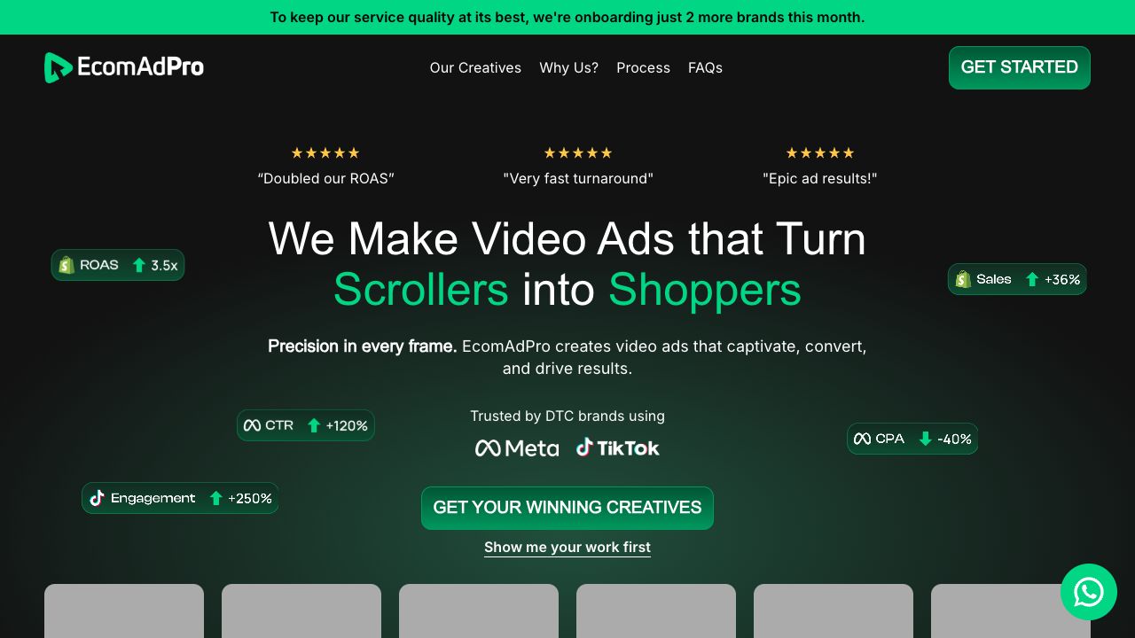EcomAdPro is a service specializing in creating high-converting video ads for e-commerce businesses. They focus on performance-focused content for platforms like TikTok, Facebook, Instagram, and YouTube Shorts, helping brands and agencies lower CPA and drive growth. They offer UGC creatives, attention-grabbing statics & GIFs, and repurpose existing content.