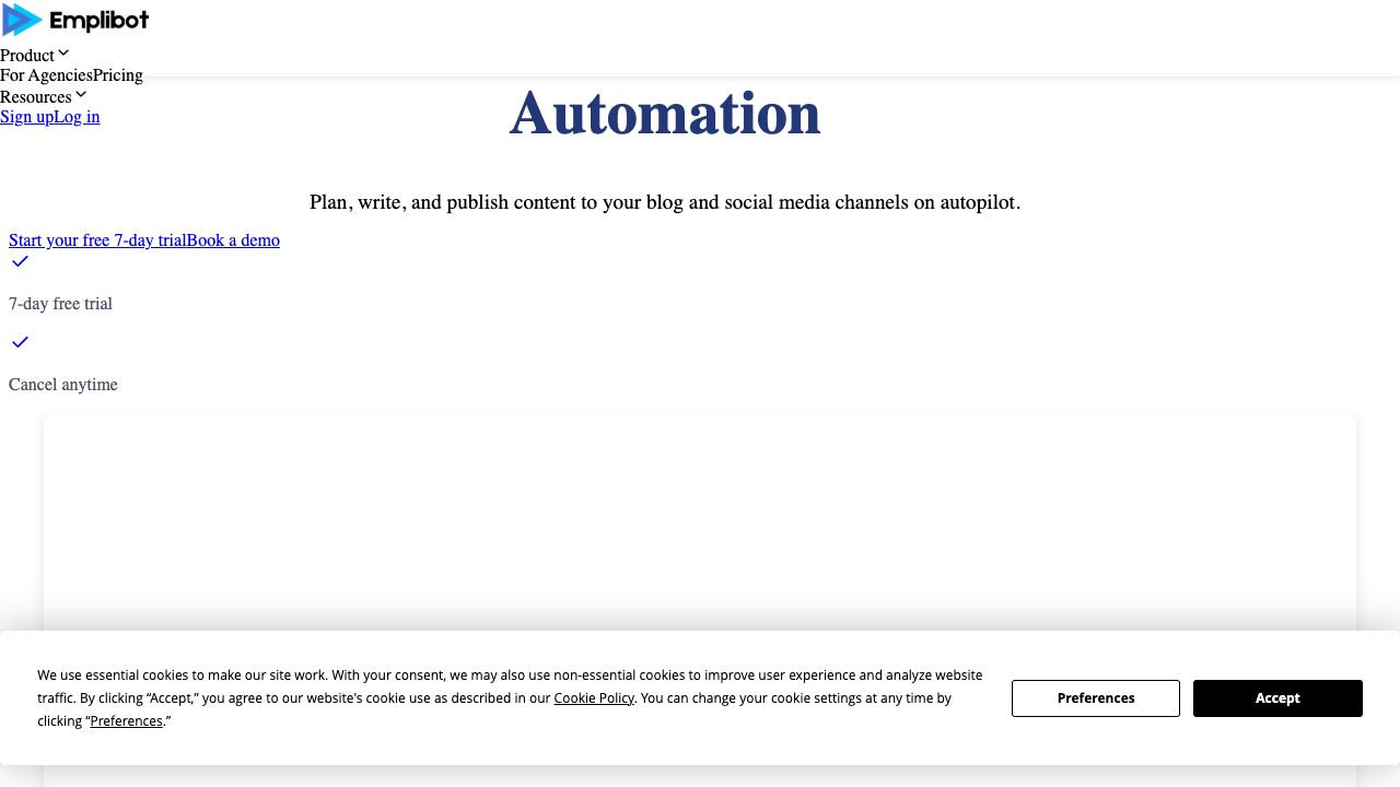 Emplibot is an AI-powered content marketing automation platform designed to help businesses plan, write, and publish content to their blog and social media channels on autopilot. It automates content planning, writing, and publishing, allowing users to focus on other important aspects of their business. Emplibot analyzes a business and its audience to research keywords and create an optimized content calendar. It also generates high-quality, SEO-optimized content automatically and allows users to auto-publish to their website and social media accounts at optimal times.