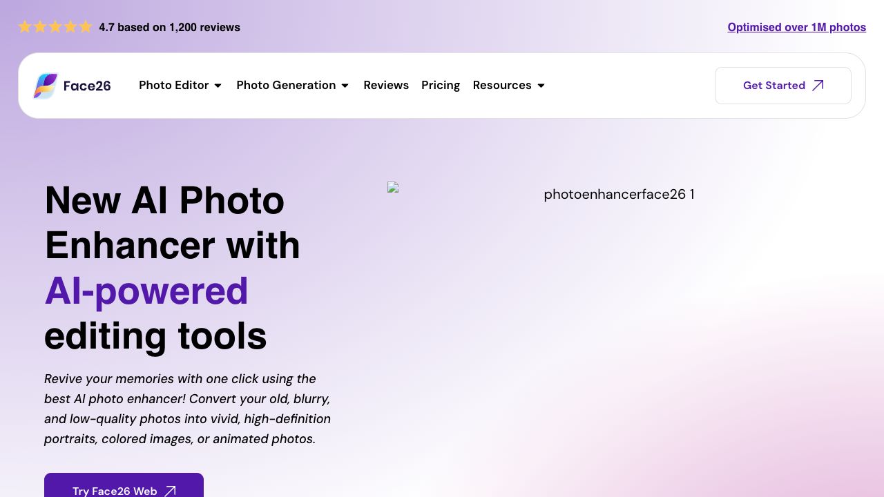 Face26 is an AI-powered platform designed to enhance, transform, colorize, upscale, and restore photos. It offers a range of AI photo editing tools to improve image quality, sharpen details, remove blur, and add color to black and white photos. Face26 aims to revive memories by converting old, blurry, and low-quality photos into vivid, high-definition portraits and animated photos.