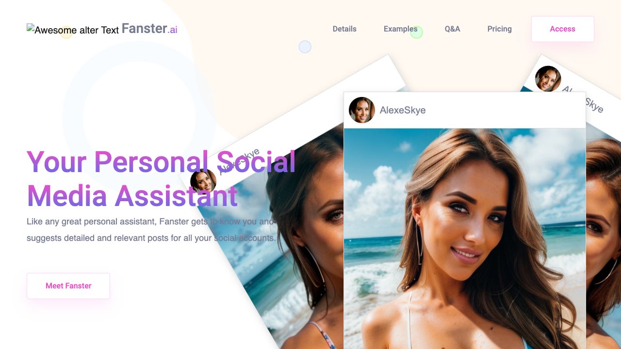 Fanster.ai is a social media assistant that uses AI to suggest detailed and relevant posts for all your social accounts. It gets to know you by analyzing your pictures and the information you provide about your passions and hobbies. Fanster then generates post ideas, captions, hashtags, and even images featuring you in different fun activities.