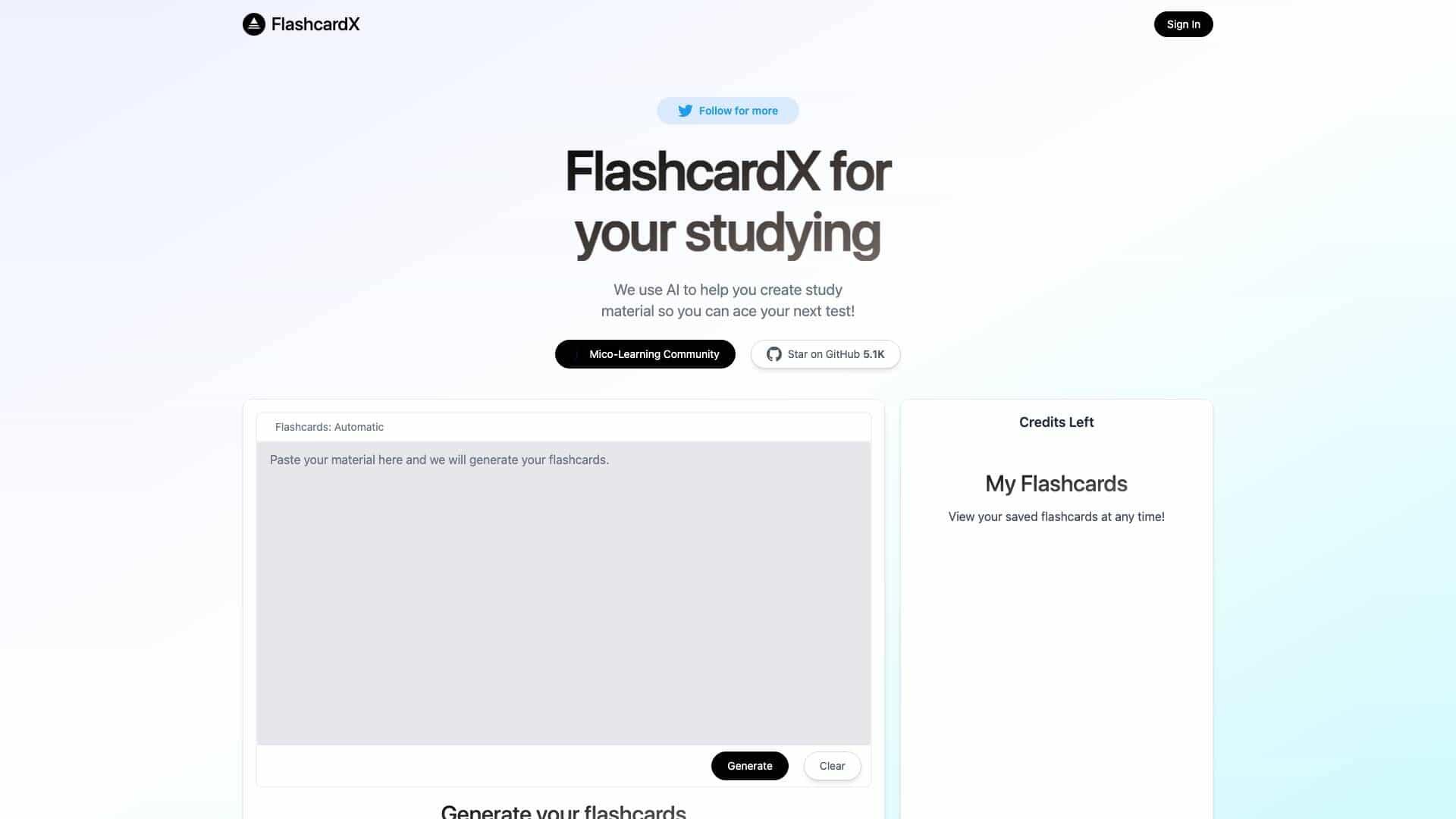 FlashcardX is an AI-powered online platform that helps students create study materials.