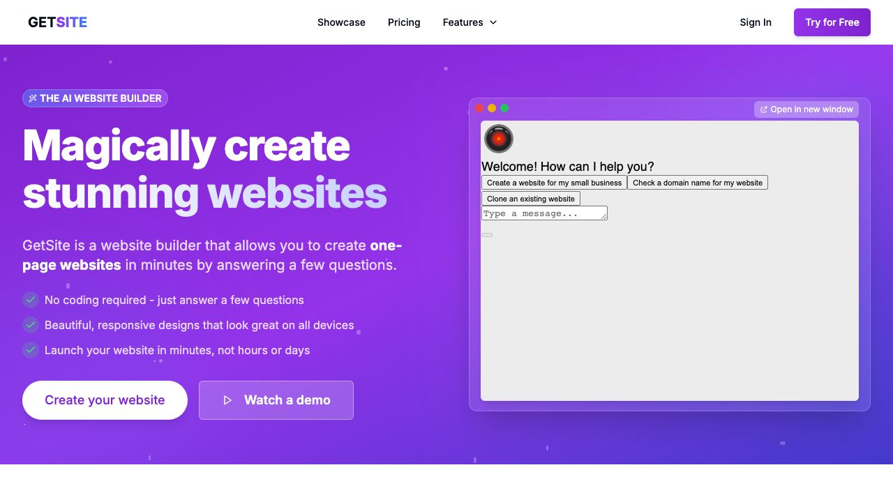GetSite is an AI website builder that allows users to create beautiful one-page websites in minutes by answering a few questions. No coding is required, and the designs are responsive, looking great on all devices. It offers various tools for generating website designs, SEO meta tags, logos, and more, and integrates with Zapier for automation.