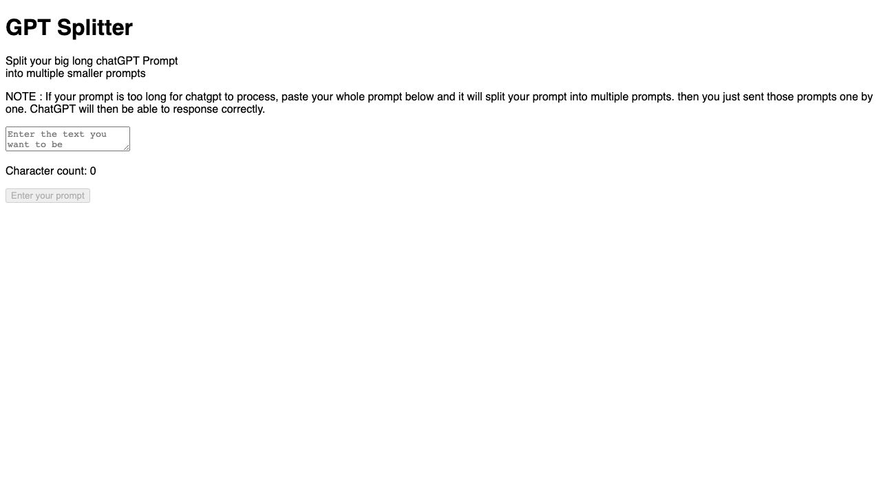 To use GPT Splitter, paste your long prompt into the provided text area. The tool will automatically split the prompt into multiple smaller prompts. Then, send these prompts to ChatGPT one by one to get a correct response.