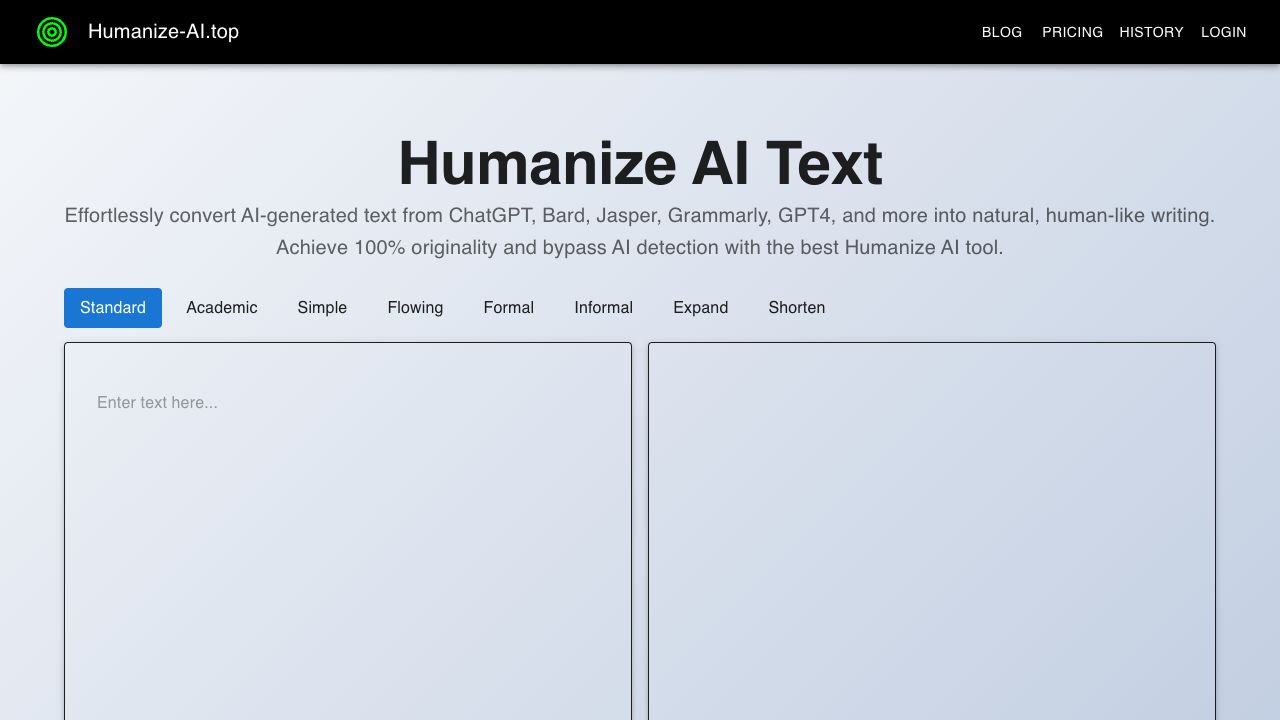 Humanize-AI.top is an online tool designed to convert AI-generated text from platforms like ChatGPT, Bard, Jasper, Grammarly, and GPT4 into natural, human-like writing. It aims to bypass AI detection and achieve 100% originality.