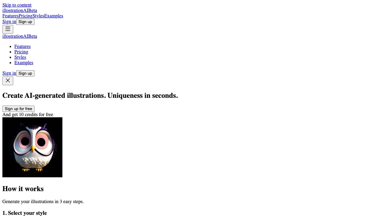 illostrationAI is an AI-powered tool that generates unique illustrations in seconds. It allows users to create AI-generated artwork by selecting a style, describing the object, and improving the result with AI upscaling. Users can choose from various styles like 3D renders, vector, low poly, Pixar style, icon, and pixel art. The platform also offers features like background removal, custom background addition, and bulk illustration creation via CSV upload. A Figma plugin is planned for future integration.