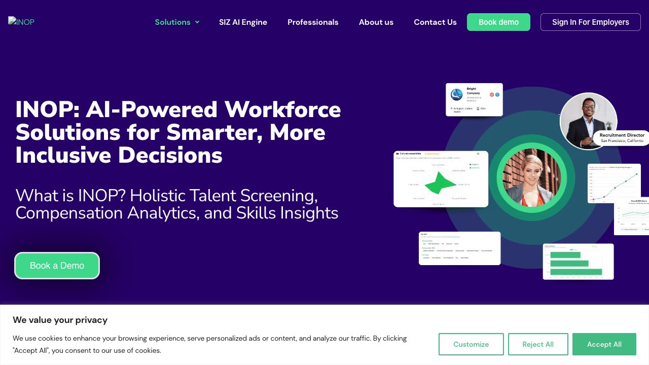 INOP is a professional network featuring a market intelligence platform that provides company ESG practices and reputational data. The AI-powered platform creates meaningful connections and job opportunities based on values and interests. It offers workforce management solutions for smarter hiring, pay transparency, and skills insights. INOP provides holistic talent screening, compensation analytics, and strategic workforce planning, empowering organizations to make more inclusive workforce decisions with AI-driven technology.