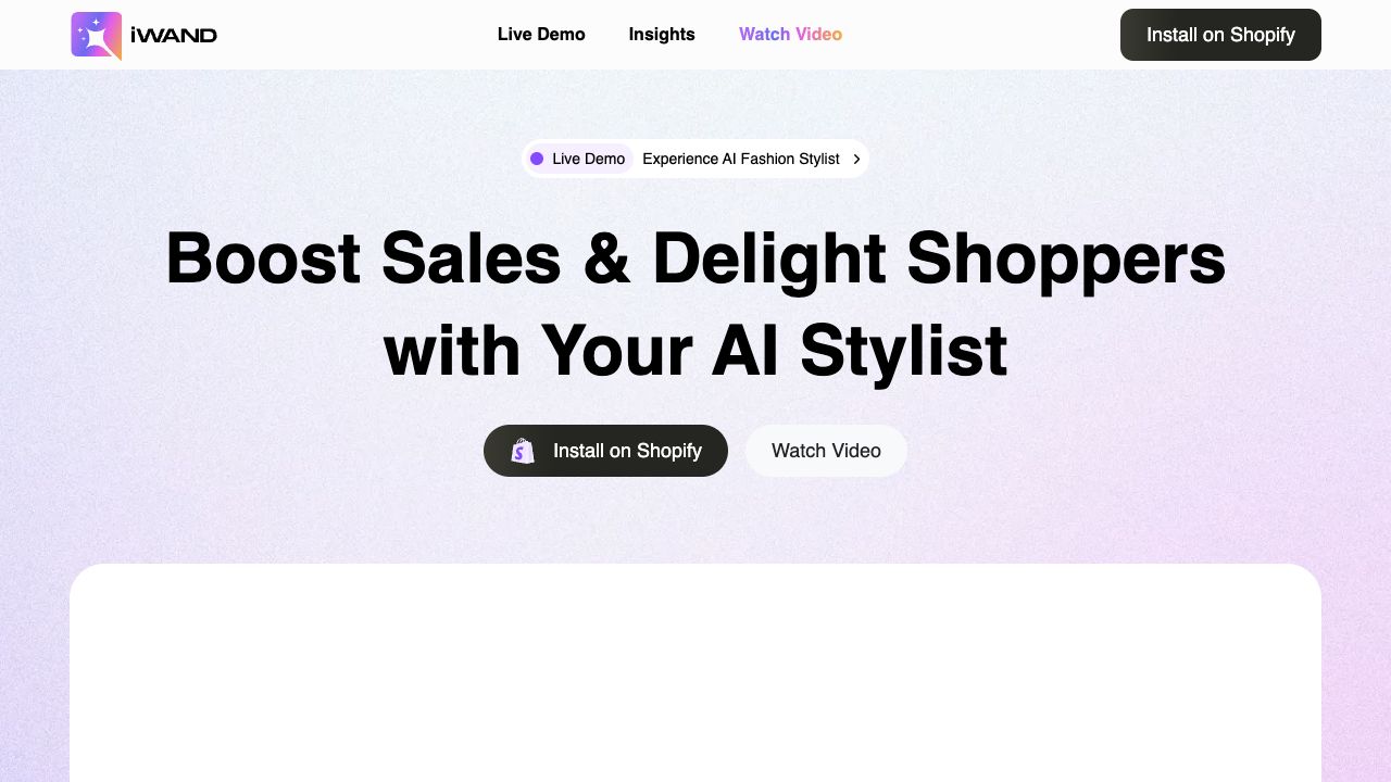 iWand is a different experience of discovering your favorite clothes among millions of products from brands. Discovery by assistant, bloggers, and style feeds with advanced AI models has turned Iwand into a magic wand that will make you more beautiful. iWAND is an AI-powered fashion stylist solution designed for fashion e-commerce, particularly for Shopify stores. It acts like a human stylist, personalizing shopping to boost sales and delight customers.
