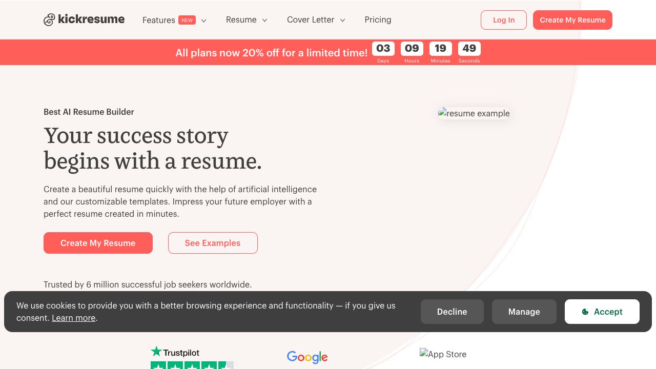 Kickresume is an all-in-one career toolbox that helps you create a beautiful resume or cover letter in seconds with the help of AI and customizable templates. It’s powered by OpenAI’s GPT-3 and GPT-4, the world’s most powerful language models, and it can automatically produce text indistinguishable from human writers. Kickresume also offers website builder, resume checker, AI resignation letter generator, career map and proofreading services.