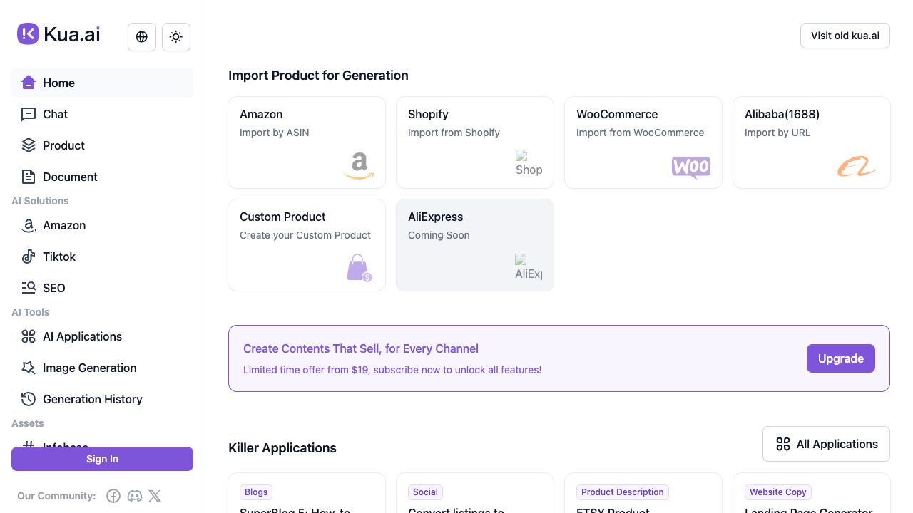 Kua.ai is an AI content generator built for e-commerce, creating premium content such as Amazon listings, product photos, social posts, and blogs. It caters to cross-border platforms, sellers, and service providers, offering AI-powered generations and conversations with unlimited custom AI templates and workflows, integrated with Amazon and Google data.