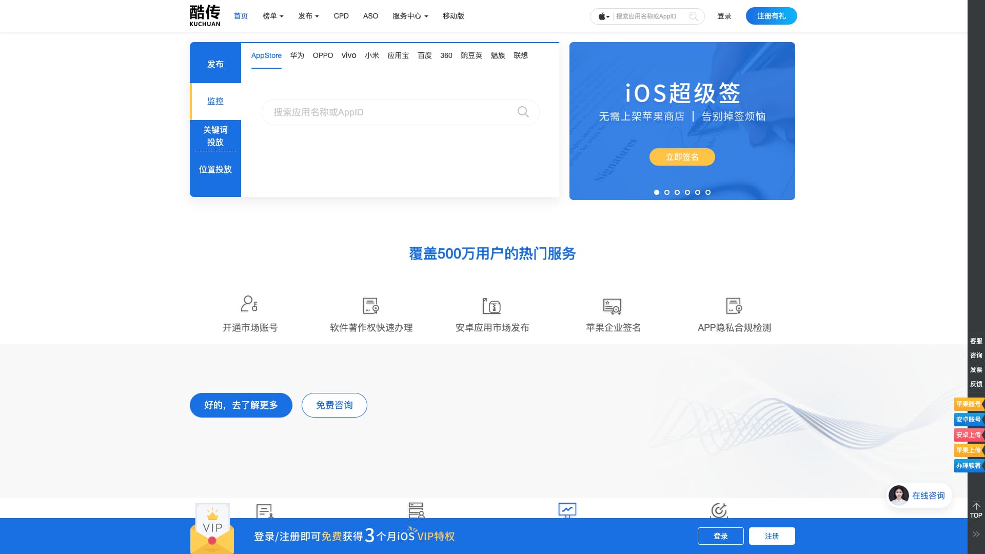 Operated by Beijing Kuchuan Technology Co., Ltd, Kuchuan is a developer-oriented platform that offers one-stop services for publishing apps across multiple app stores, monitoring app performance and rankings, optimizing SEO and keyword presence, and supporting promotional campaigns as well as related developer services.