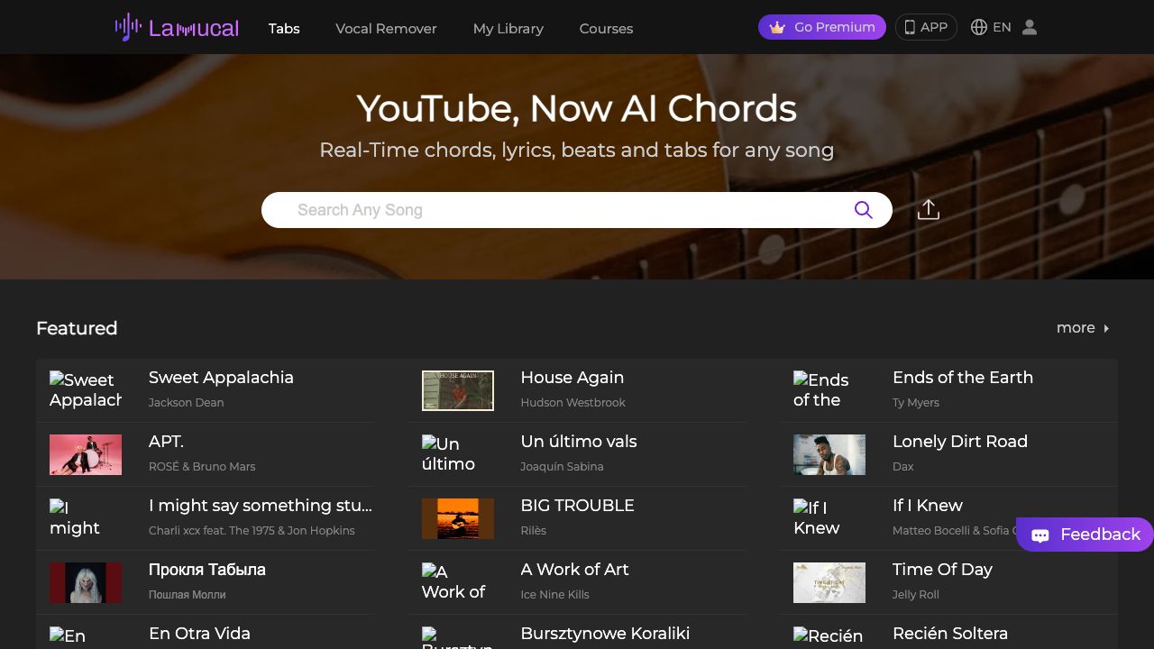 Users can search for songs on YouTube or upload their own MP3, M4A, or OGG files to generate chords, tabs, and lyrics. The site also offers tools to edit, transpose, separate tracks, and remove vocals. Interactive learning features are available to help users learn to play along with guitar, ukulele, or piano.