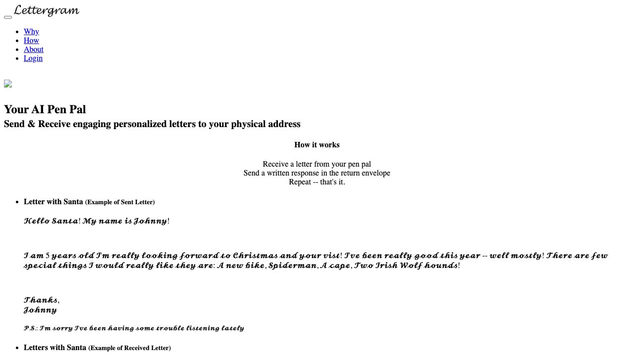 Lettergram is a service that provides AI pen pals who correspond with you via postal mail. You receive a physical letter from your AI pen pal, write a response, and send it back in a return envelope. You can choose from various pen pal personas, such as Santa, a life coach, a Civil War soldier, or create your own.
