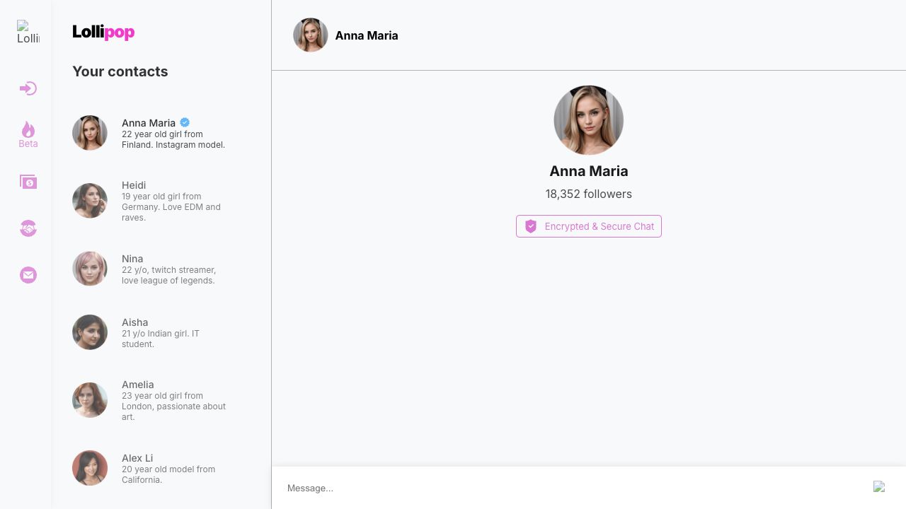 Lollipop AI Girls is a platform where users can interact with realistic AI girls through chat, voice messages, and photo requests. It offers an AI girlfriend experience with various AI characters like Anna Maria, Heidi, and Aisha.