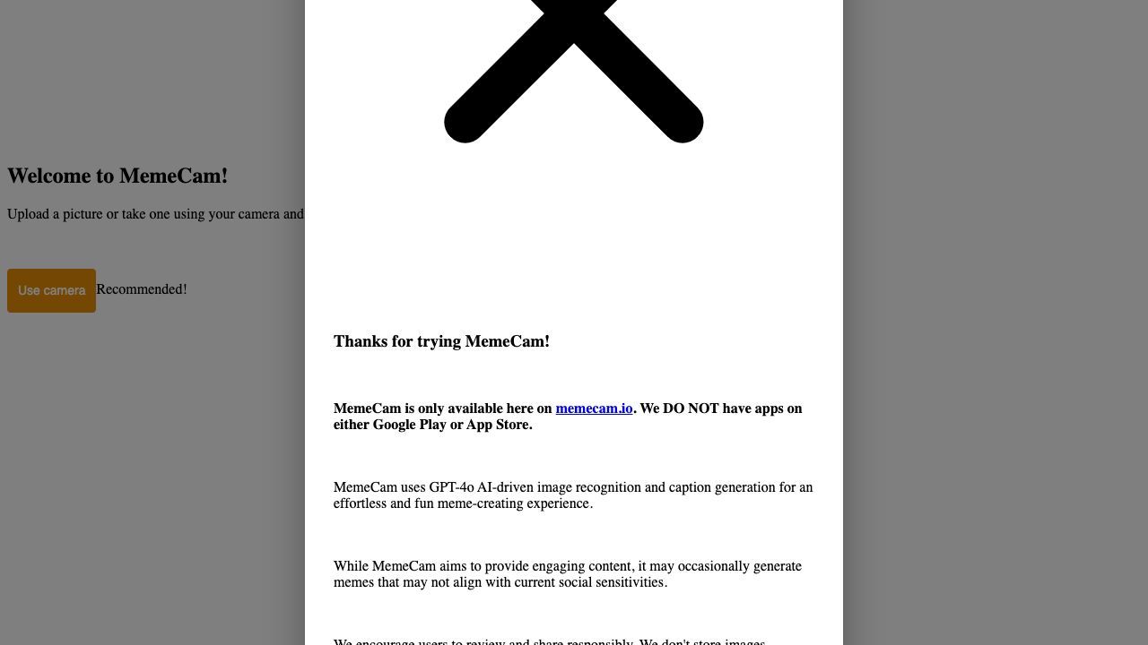 MemeCam is an AI-powered meme generator that uses GPT-4o to create memes from uploaded or captured images. It aims to provide a fun and effortless meme-creating experience.