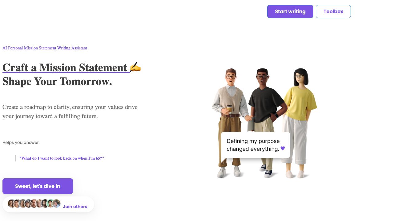 MissionMapper is an AI-assisted personal mission statement creator dedicated to helping individuals craft meaningful mission statements for a clearer path forward. It guides users in defining their life's purpose and direction with clarity, paving the way for a more focused and meaningful future. The tool helps users answer the question: \"What do I want to look back on when I’m 65?\"