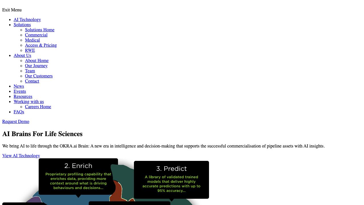 Explore the AI Technology Solutions and Solutions sections to understand how OKRA.ai's AI Brain can be applied to various aspects of life sciences, such as commercial optimization, medical intelligence, access & pricing strategies, and real-world evidence utilization. Request a demo for a personalized walkthrough.