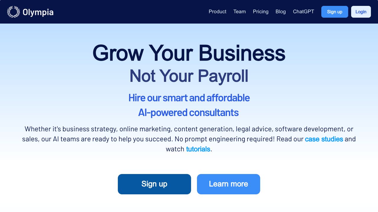 Sign up on the Olympia website, choose a plan, and start working with AI consultants for various business needs. No prompt engineering is required.