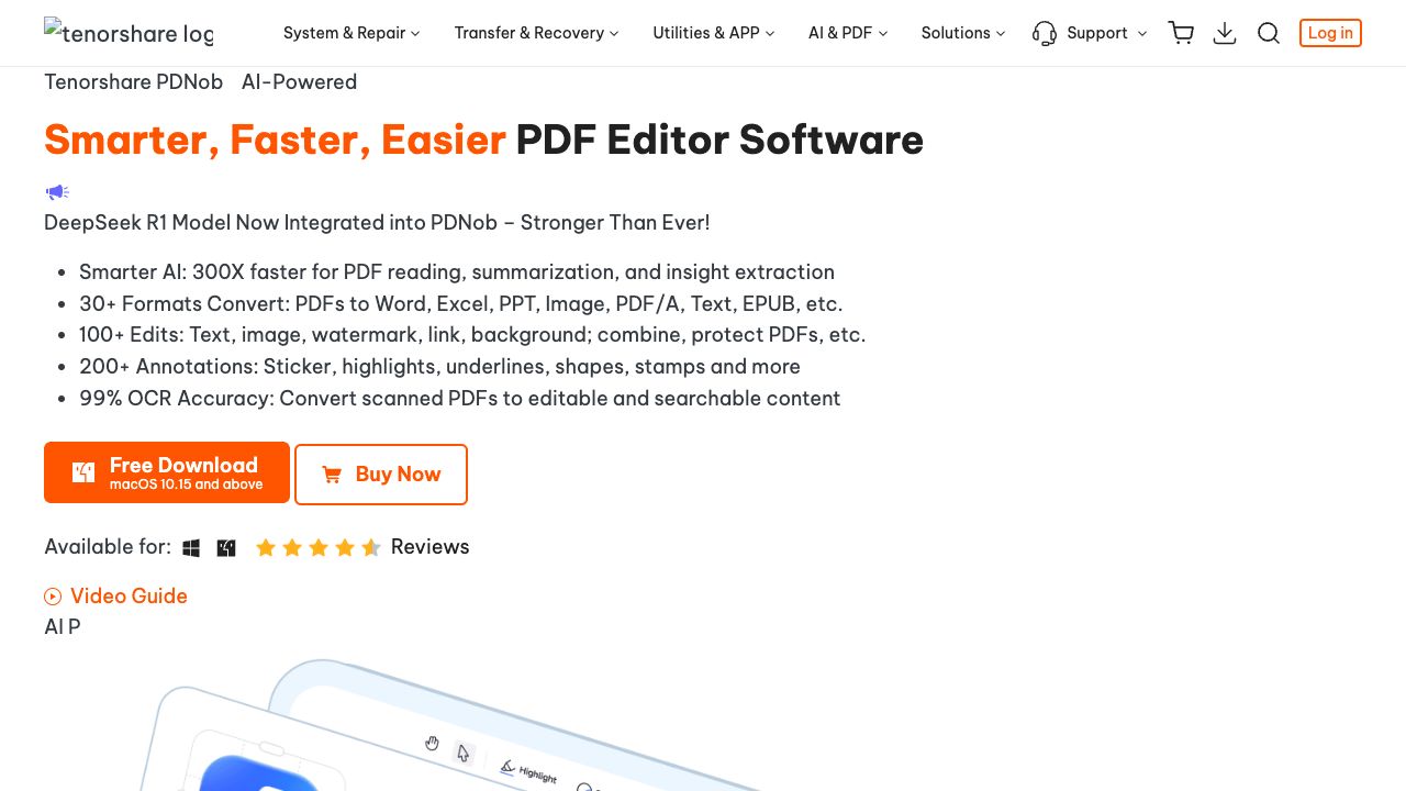 PDNob PDF Editor is an AI-powered PDF editor software available for Windows and Mac. It allows users to view, edit, convert, annotate, extract, create, compress, and organize PDF files. The software integrates DeepSeek R1 Model for faster PDF reading, summarization, and insight extraction. It supports converting PDFs to various formats like Word, Excel, PPT, and images, and offers extensive editing features for text, images, watermarks, and links. PDNob PDF Editor also provides OCR functionality for converting scanned PDFs into editable content.